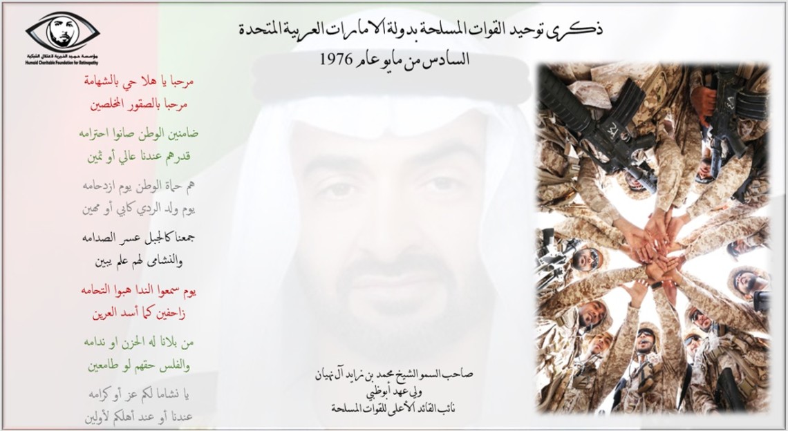 (إنَّ رخاءَ المجتمع وتقدُمِهِ لا يُصانان إلا بوُجودِ قوّاتٍ مسلحةٍ رادعةٍ، تكونُ الدّرعَ الواقيَ والسّياجَ الحصينَ لهذا الوطنِ ولأبنائِهِ) الشيخ زايد بن سلطان آل نهيان -طيّب الله ثراه-