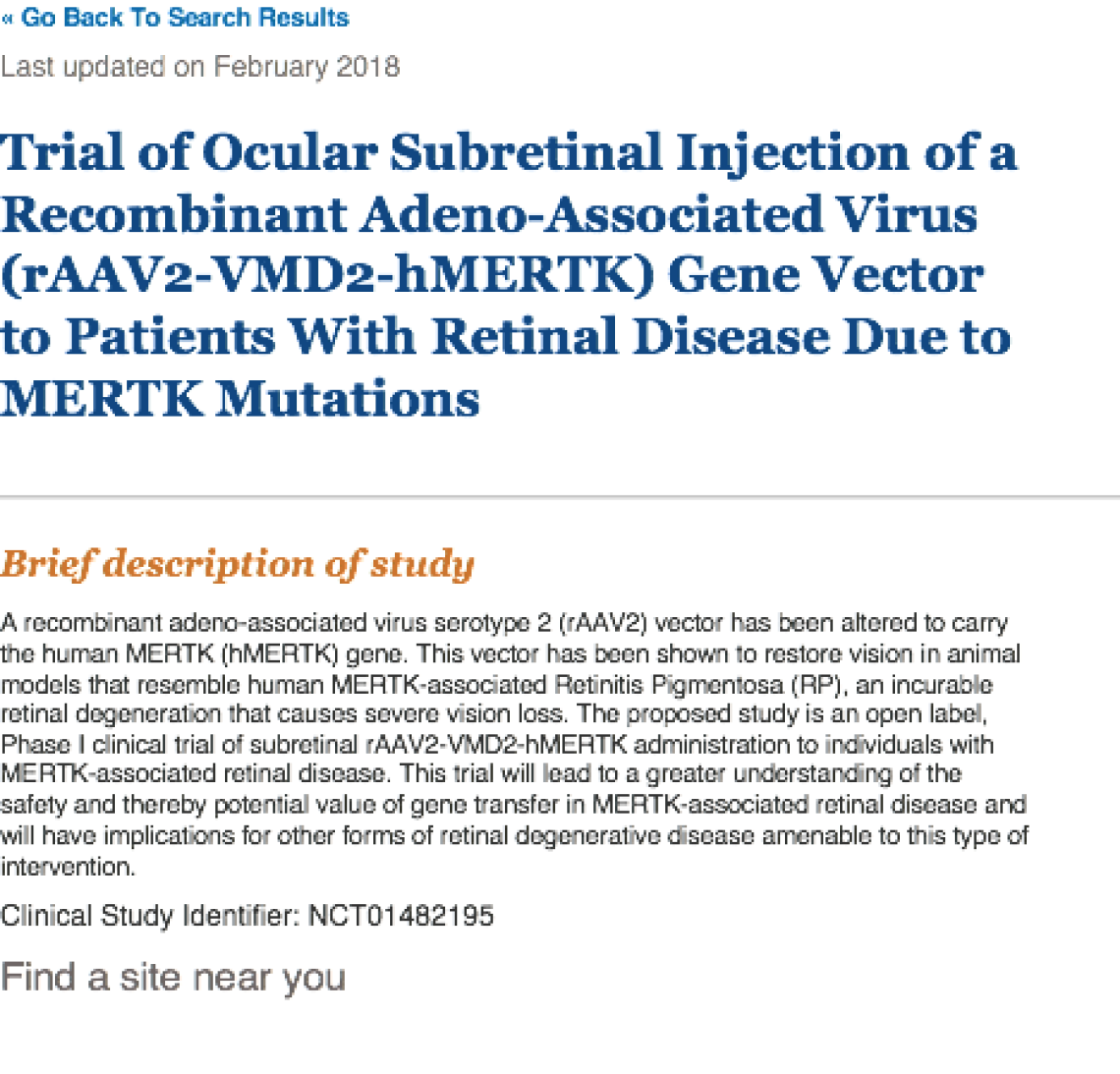 تم تغيير والمؤتلف الغدة المرتبطة بفيروس المصلي 2 (rAAV2) ناقلات لنقل MERTK (hMERTK) الجينات البشرية. وقد تبين هذا متجه لاستعادة الرؤية في النماذج الحيوانية التي تشبه المرتبطة MERTK البشري التهاب الشبكية الصباغي (RP)، وتنكس الشبكية العضال الذي يسبب فقدان الرؤية الحاد. الدراسة المقترحة هي فتح التسمية، المرحلة الاولى من التجارب السريرية لإدارة rAAV2-VMD2-hMERTK تحت الشبكية للأفراد يعانون من مرض شبكية العين المرتبطة MERTK. وهذه المحاكاة تؤدي إلى فهم أكبر من السلامة والقيمة وبالتالي المحتملة لنقل الجينات في أمراض الشبكية المرتبطة MERTK وسيكون لها انعكاسات على أشكال أخرى من الشبكية قابلة الأمراض التنكسية لهذا النوع من التدخل.